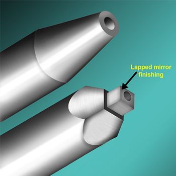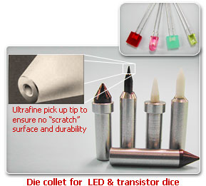 A wide range of high performance die pick up tool (die collet) with hole size down to 0.100 (4 mils). The lapped mirror finished carbide tip prevent scratch marks on the surface of the die.