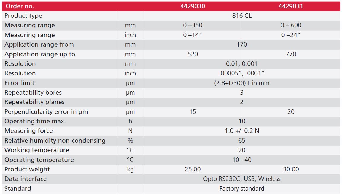 • Package contains: height measuring instrument incl. operating and display unit, carrier 817h1, probe K6/51, setting block 817 eb, instruction manual, power source, protection cover, calibration certificate