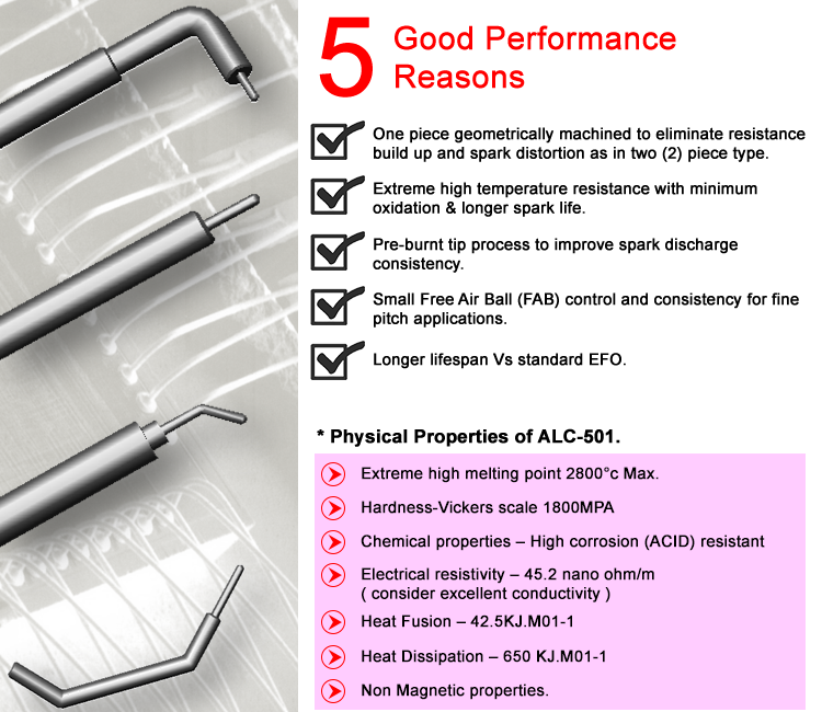 LD Microprecision EFO is more than an EFO. We have done extensive research and collaborated with our Advanced Material Manufacturer to select the optimum material most suitable for the manufacturing of the spark rod. The composite alloy material is called ALC-501* widely used in the aerospace industry. It is applicable for both gold and copper wires application. Full range applicable to K&S, ASM, Esec, Kaijo, Shinkawa and others available.