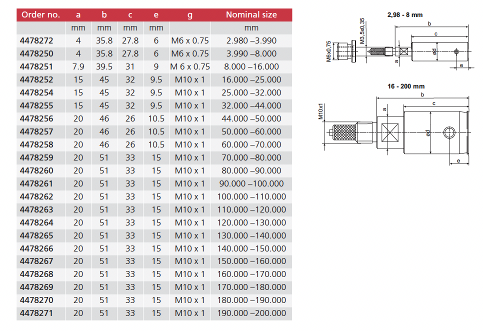• Measuring head has a hardened chromium plated cylinder guide and carbide tipped anvils