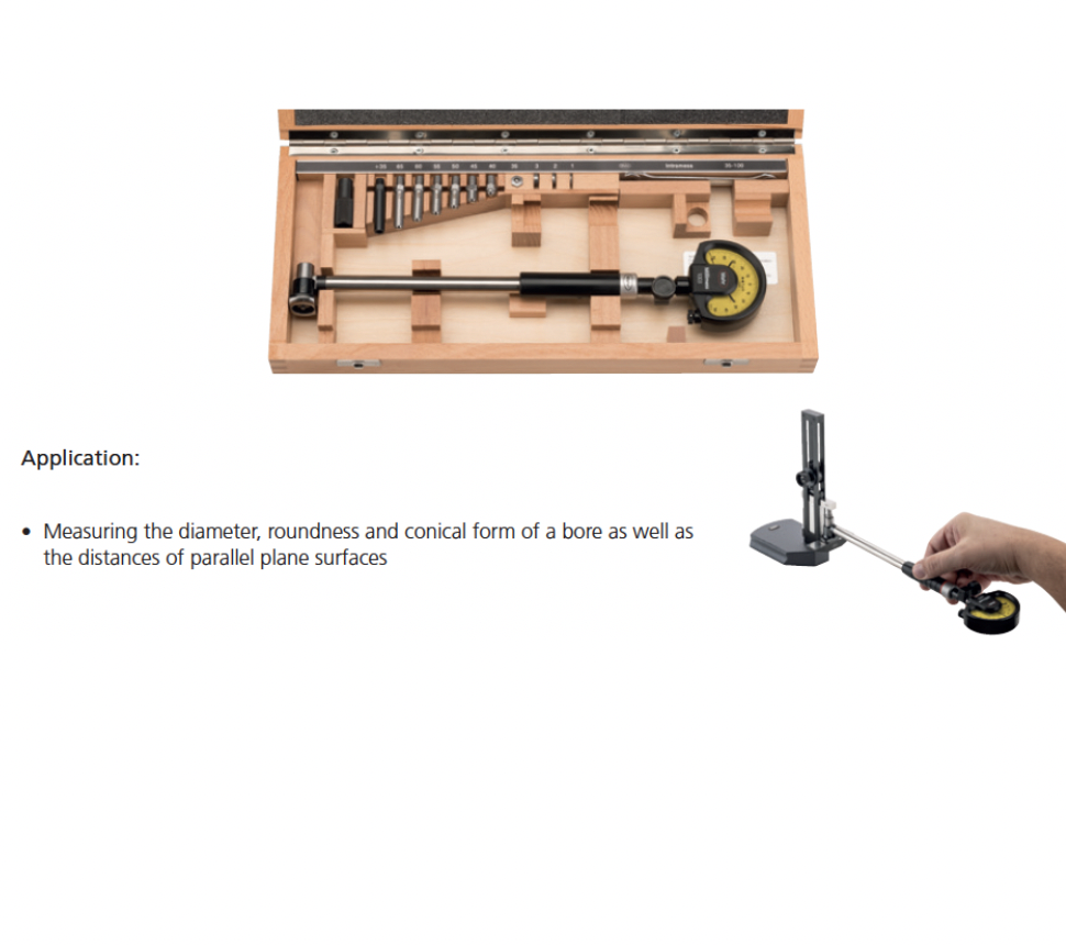 • Package contains: measuring holder, measuring head, anvil spindle, wooden case, excludes indicator