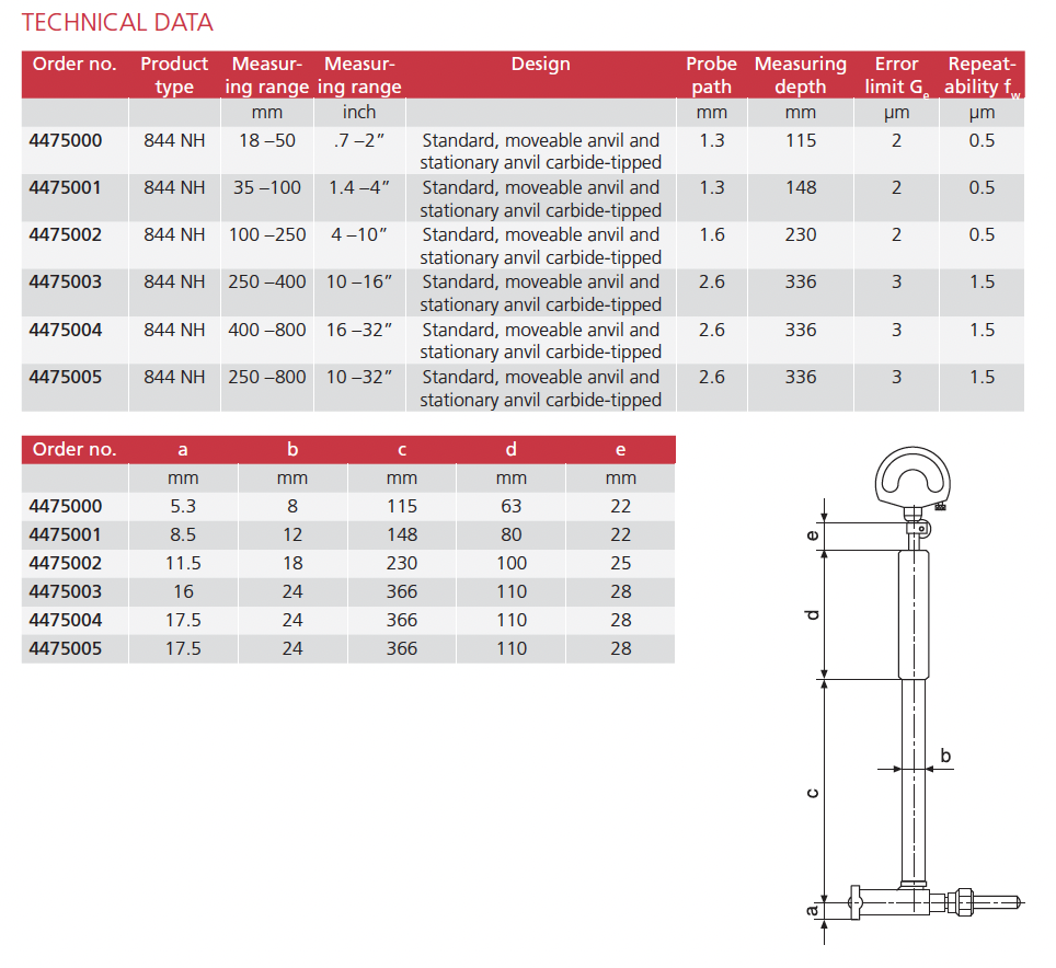 • Measuring head consists of a carbide tipped moving anvil and an interchangeable stationary anvil with a carbide ball