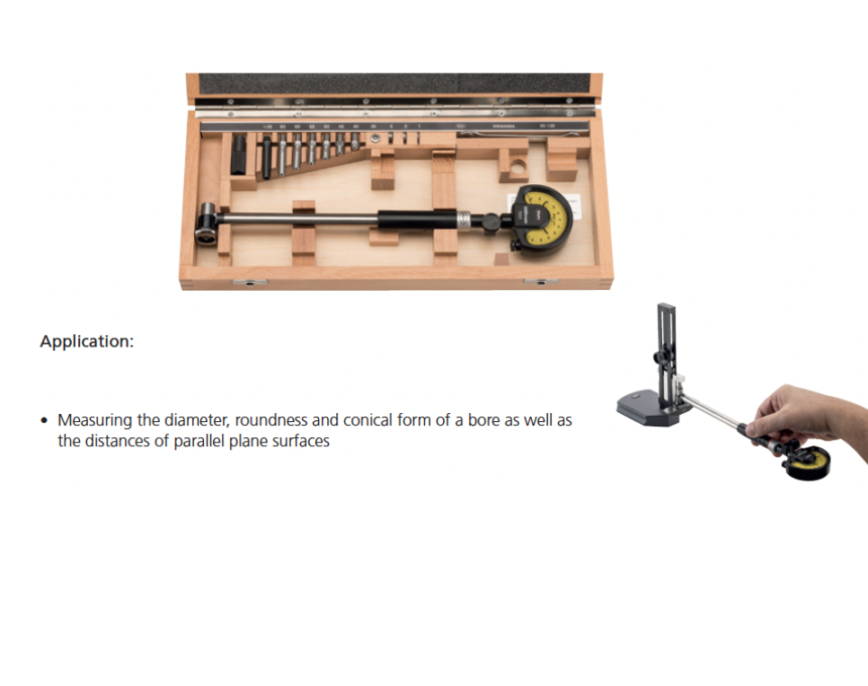 • Package contains: measuring holder, measuring head, anvil spindle, wooden case, excludes indicator