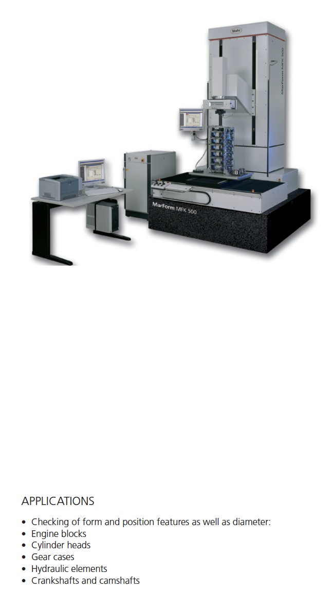 • MFK form measuring center for comprehensive workpiece assessment. MFK form tester – ideal for testing engine blocks, cylinder heads, gear cases, hydraulic elements, crankshafts and camshafts. Generously sized, optimized design for high measuring accuracy throughout the machine. Long measuring and travel paths for easy, safe workpiece changing.