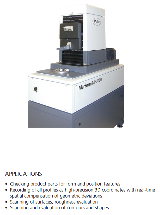 • For decades, MarForm measuring machines have been recognized for their accuracy and stability. The new MarForm MFU 100 was developed with the claims of testing the shape and position features of product parts in a one liter measuring volume close to the production area and at a reasonable cost. In doing so, it has taken our long experience into a new dimension.