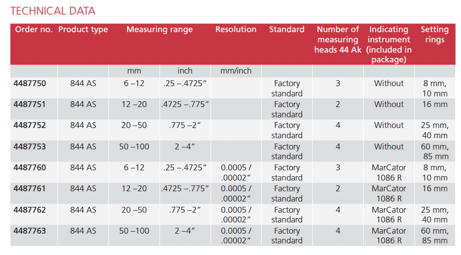 • From 40 mm all measuring heads are made from aluminium to reduce weight