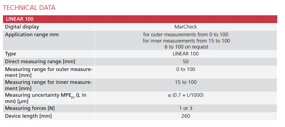 • The LINEAR 100 is a universal, easy to operate length measuring instrument for quick and precise outside and inside measurements up to 100 mm, directly on the production line. The simple design of the instrument speeds up the measurement process and makes it quick and easy to adapt to new measuring tasks.