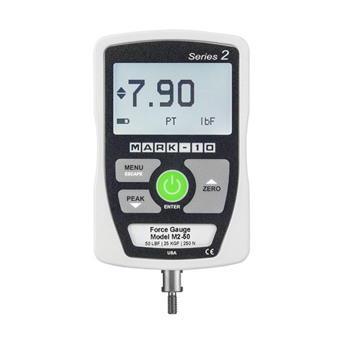 Series 2 digital force gauges are designed for basic tension and compression force testing applications up to 500 lbF (2,500 N). Peak tension and compression readings are reliably captured via the gauges’ ±0.5% accuracy and 500 Hz sampling rate. A backlit graphic LCD displays the current, peak tension, or peak compression reading.